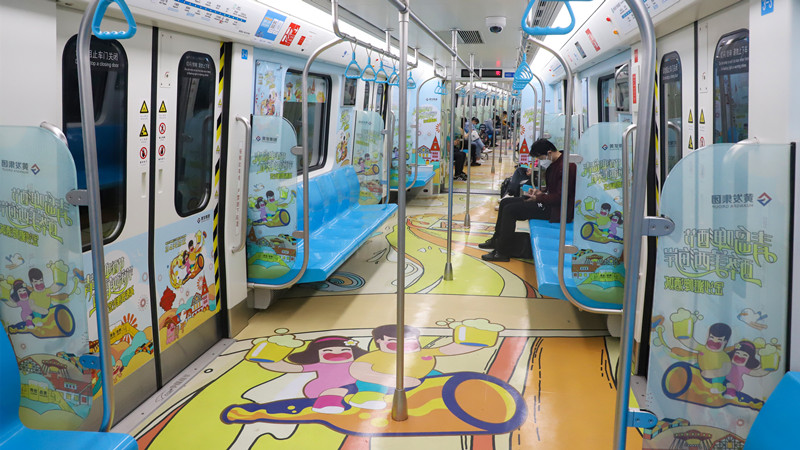 “地鐵專列利用車廂的立體空間,以插畫手繪風為主要設(shè)計風格,將金沙灘啤酒城IP形象——‘哈舅’作為靈魂人物,帶領(lǐng)乘客穿梭于六大主題車廂間,共同感受新區(qū)魅力,打造了場景化的品牌營銷,帶給乘客沉浸式體驗?!秉S發(fā)集團策劃部工作人員趙益弘介紹。