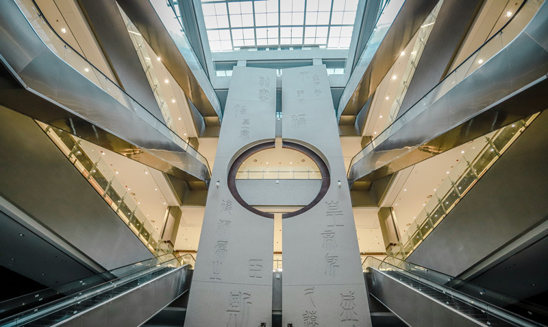 從空中俯覽,博物館、圖書館、科技館三個(gè)文化場(chǎng)館呈品字布局,之間有數(shù)條連廊貫通,既相互獨(dú)立,又渾然一體。博物館外立面設(shè)計(jì)端莊大氣,極具歷史人文氣息;圖書館一處紅色外立面采用剪紙藝術(shù)設(shè)計(jì)而成,十分搶眼;科技館運(yùn)用線條和凹凸變化,將科幻元素巧妙融入建筑之中。